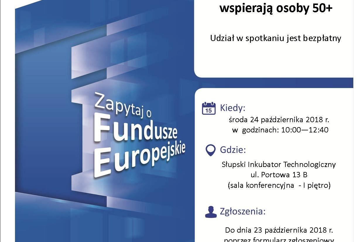 Lokalny Punkt Informacyjny Funduszy Europejskich w Słupsku zaprasza na spotkanie informacyjne organizowane w dniu 24 października 2018 r. poświęcone możliwościom pozyskania wsparcia przez osoby powyżej 30 roku życia, ze szczególnym uwzględnieniem osób 50+ ze środków Unii Europejskiej w perspektywie finansowej na lata 2014-2020.