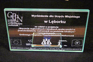 Urząd Miejski w Lęborku otrzymał wyróżnienie za udział w projekcie „Wsparcie wojewódzkich i gminnych społeczności lokalnych w przeciwdziałaniu narkomanii”.
