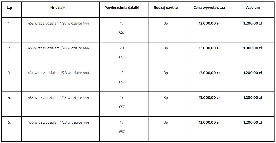 - o godz. 09.00 na sprzedaż działki nr 453 wraz z udziałem 1/28 w działce 444